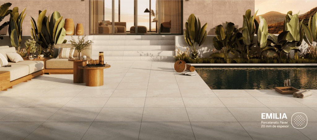Desde una perspectiva estética, los porcelanatos pavers, porcelanatos 20 mm de espesor, se alinean con las tendencias actuales del diseño arquitectónico, que privilegian la continuidad visual entre interior y exterior. Gracias a su tecnología de fabricación, reproducen con gran realismo texturas de piedra natural y concreto, permitiendo crear ambientes sobrios, contemporáneos y atemporales. Esta capacidad facilita proyectos donde el diseño fluye sin interrupciones, reforzando la sensación de amplitud y coherencia espacial.